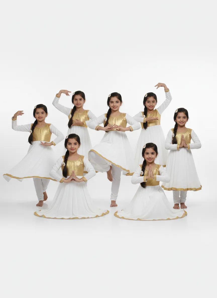 Girl's Anarkali Dress with Golden Border - White & Golden