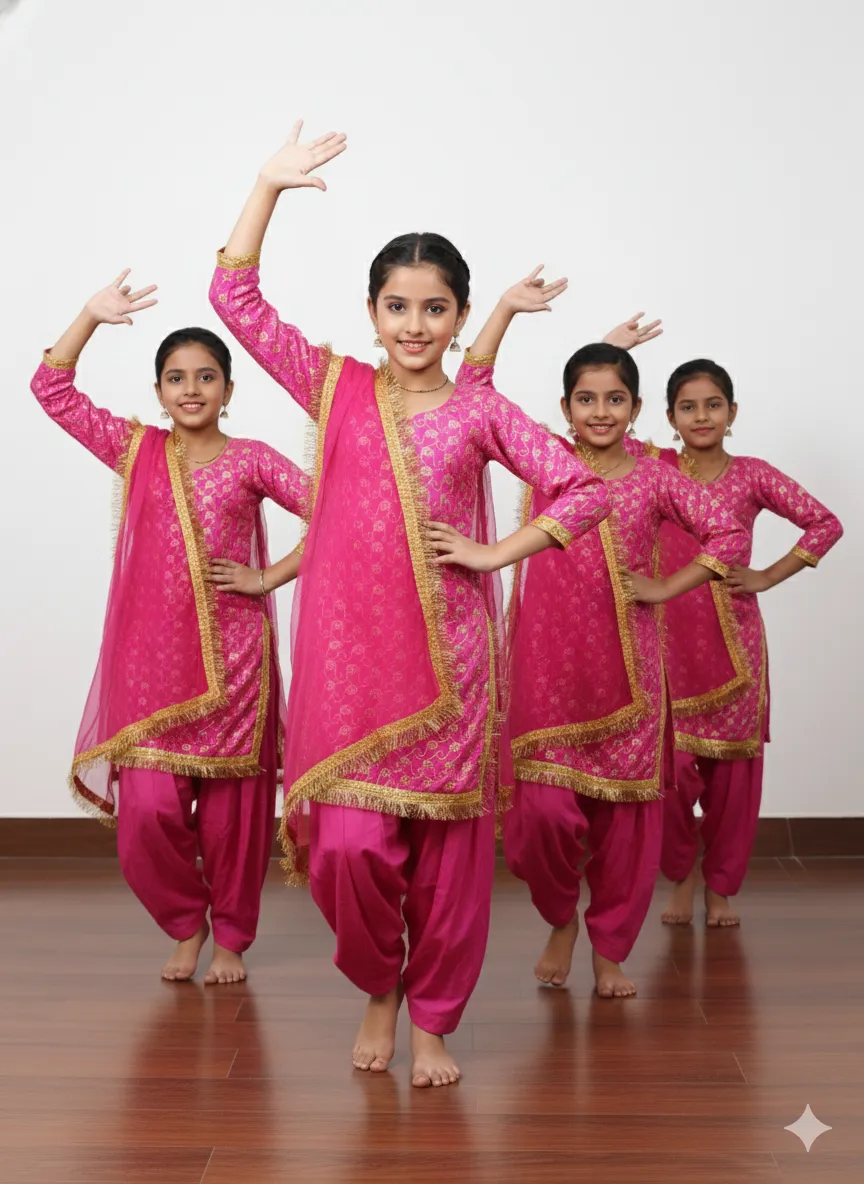 Girl's Punjabi Patiala Suit with Golden Embroidery for School Dance, Annual Day & Cultural Events - Pink & Gloden